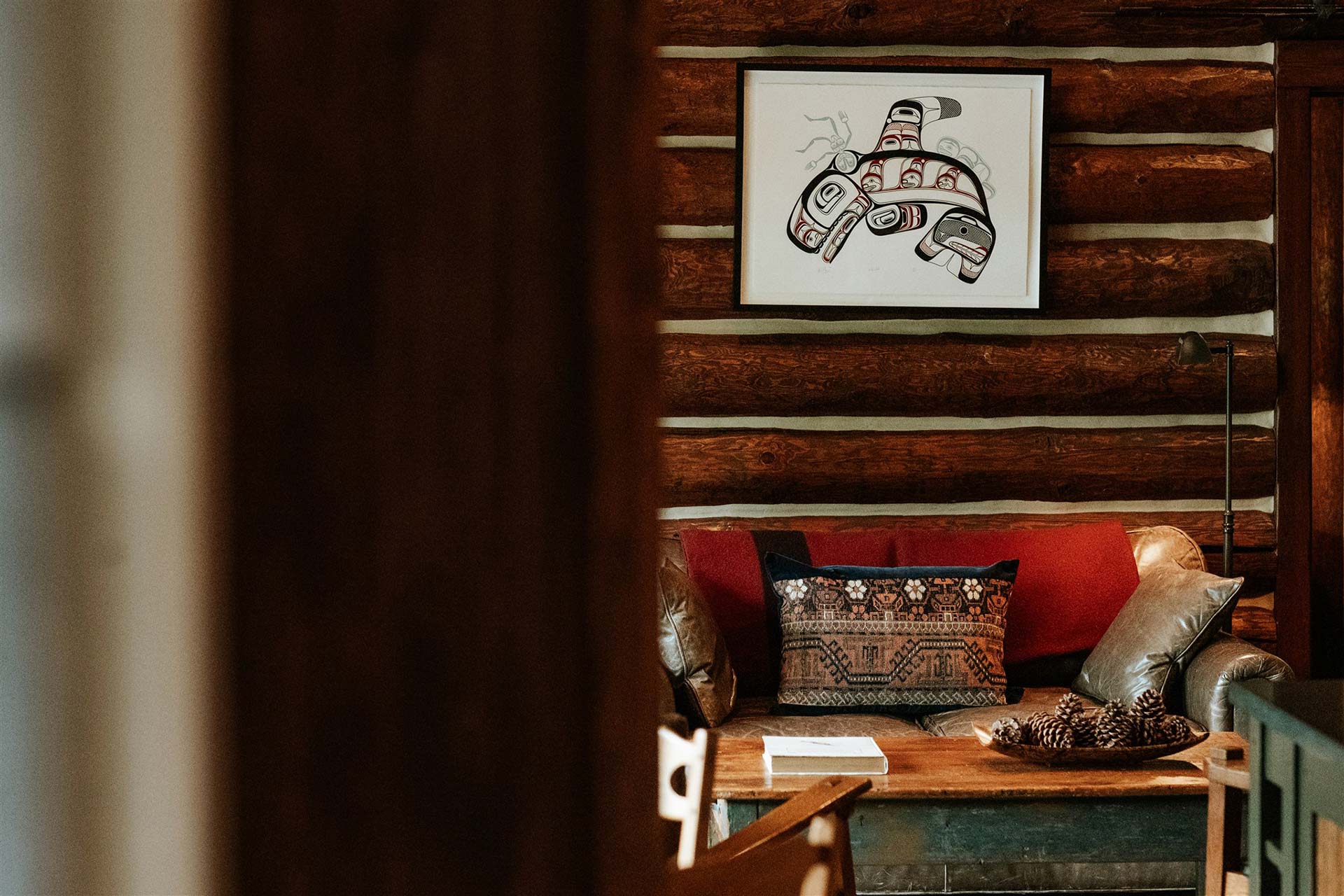 Architect Lucie Olivier of Bosco Busselli Studio describes it as “enigmatic in the mist, perfectly at home in British Columbia”—fjords and turquoise waters outside contrasted with dark, sumptuous interiors within. “As light shifts through the day, shafts cut across the logs to create rare chiaroscuro effects.”