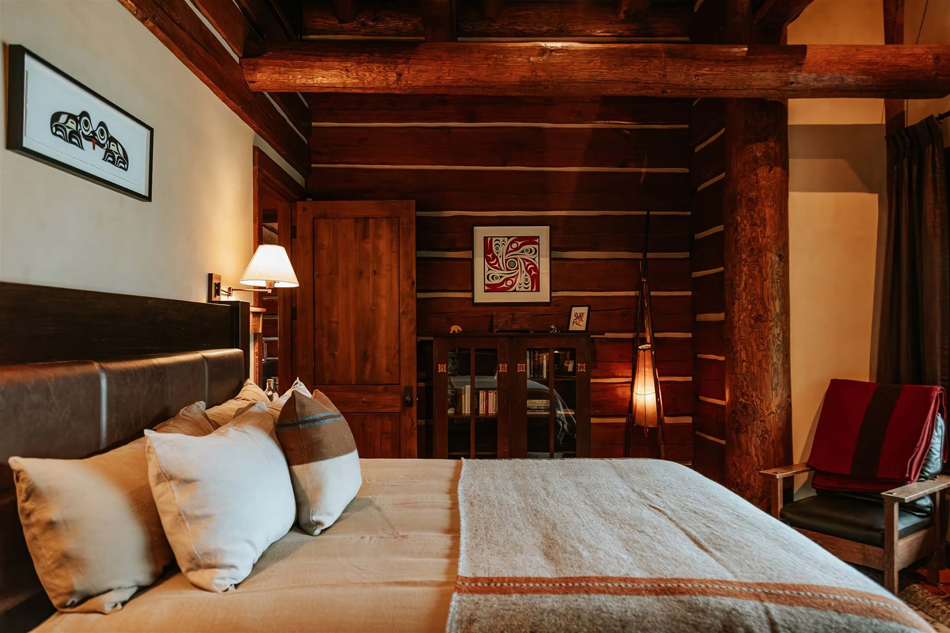 On the shores of Leask Lake, a two-bedroom log cabin offers rustic seclusion. Exposed timbers, reclaimed barn wood, and custom fixtures create a sense of tranquility that feels timeless—Hemingwayesque in its quiet.